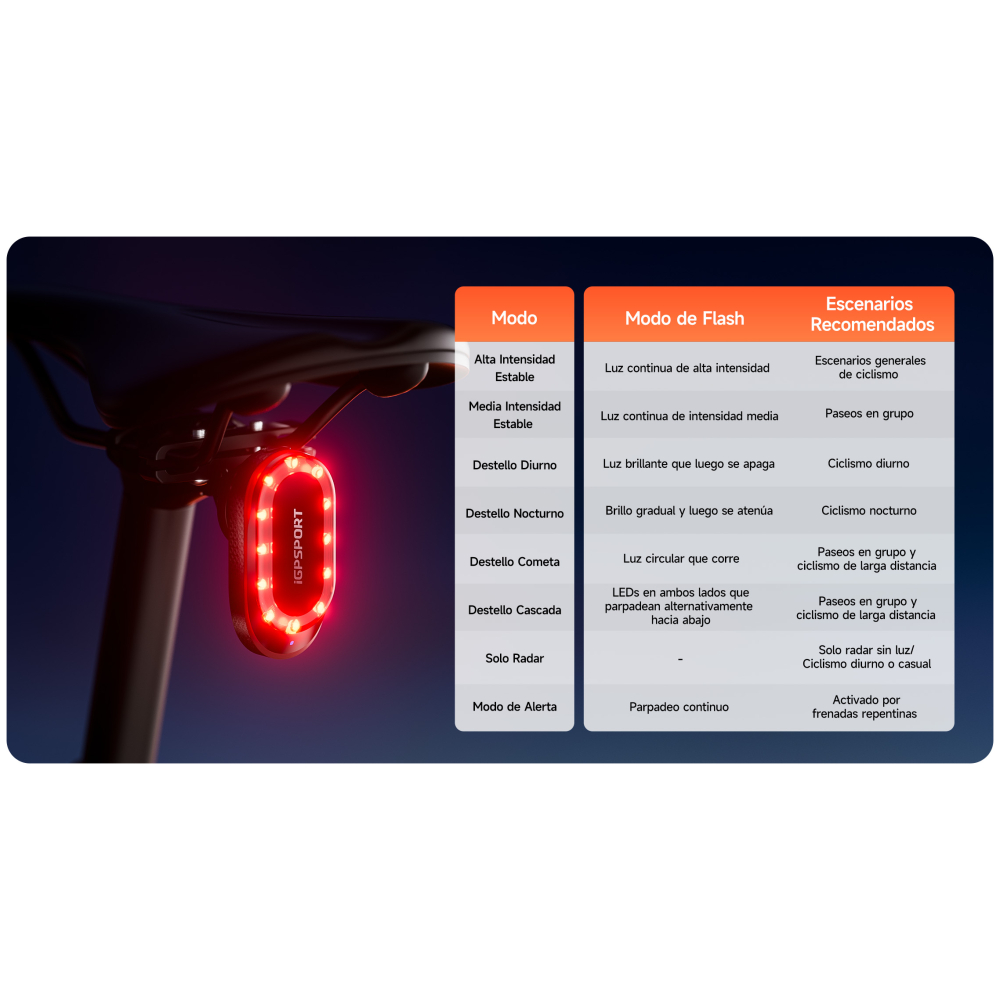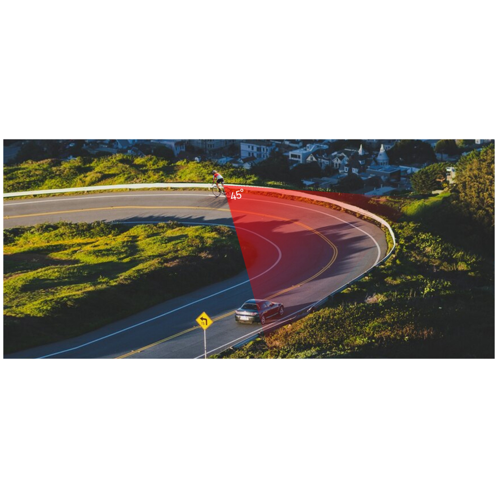 Esta luz trasera con un ángulo de detección de 45° proporciona alertas en tiempo real, permitiéndote navegar por las curvas con facilidad y asegurando la seguridad durante el ciclismo.